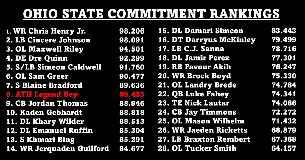 Bey’s addition brings the class to 28, and more than likely will be the complete 2026 recruiting class, unless some unforeseen recruit decides to take a similar path and decommit from their current school at the twelfth hour. The rankings you see above are The OHIO Podcast’s Buckeye Commitment Rankings, or BCR for short. We take into account the recruits scores from both 247sports and On3, along with our own recruiting experts. We also give each recruit additional scores based on offers, competition level, rival understanding, and team needs for the most comprehensive score in Buckeye Nation.